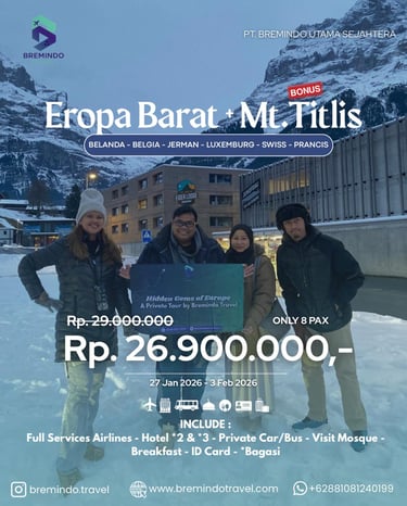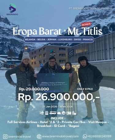 Nikmati pengalaman perjalanan eksklusif melalui program Private Tour Eropa Barat + Mt. Titlis bersama Bremindo Travel. Paket ini dirancang khusus dengan konsep perjalanan privat hanya 8 pax, memberikan kenyamanan lebih, suasana yang intim, serta fleksibilitas selama menjelajahi destinasi terbaik di Eropa.