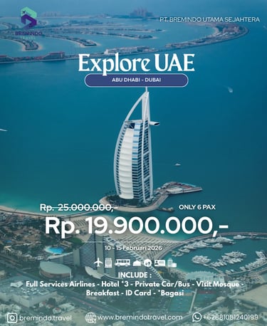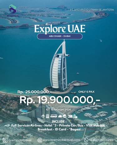 Jelajahi kemegahan Timur Tengah melalui program Explore UAE (Abu Dhabi – Dubai) bersama Bremindo Travel. Paket ini dirancang dengan konsep private tour hanya 6 pax, memberikan kenyamanan lebih dan pengalaman perjalanan yang eksklusif selama berada di Uni Emirat Arab.