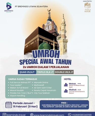 Awali tahun dengan ibadah yang lebih bermakna melalui Program Umroh Special Awal Tahun dari Bremindo Travel. Paket ini dirancang khusus untuk Anda yang menginginkan pengalaman ibadah lebih maksimal dengan 2x Umroh dalam 1 perjalanan, sehingga waktu di Tanah Suci dapat dimanfaatkan secara optimal dan lebih khusyuk.